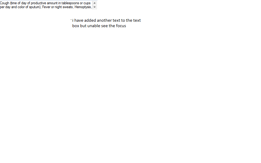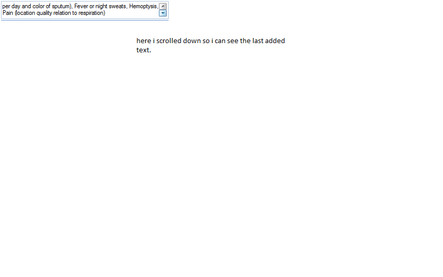 i created an sample application with rad textbox and set autoscroll property to true. i have a list box with some data wheni click the data present in the list will be added to the textbox . when i keep on adding in this way i am unable to see the focus of the data in the text box .