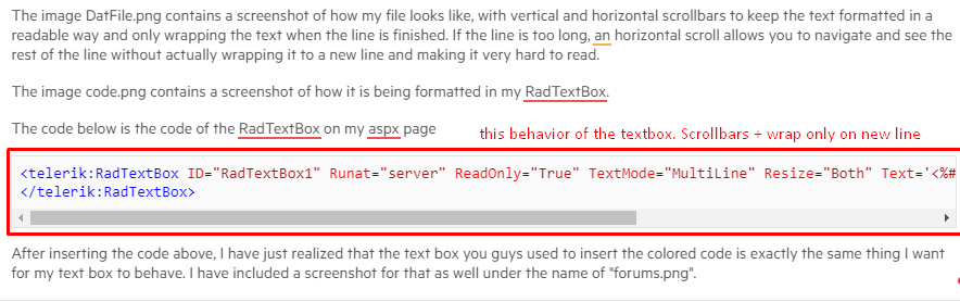 </telerik:RadTextBox>After inserting the code above, I have just realized that the text box you guys used to insert the colored code is exactly the same thing I want for my text box to behave. I have included a screenshot for that as well under the name of "forums.png".