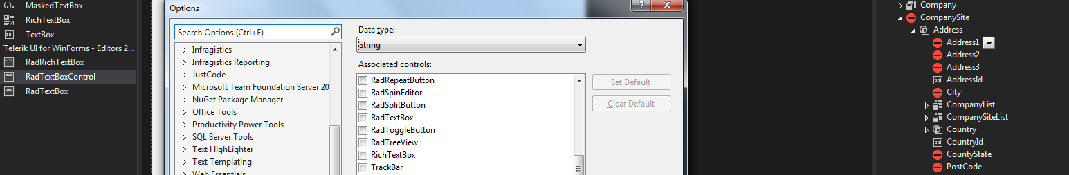 I'm using the Entity Framework with a Data Source and I would like to be able to drag and drop a field and have it be edited with a RadTextBox. When I go to customize, I see 15 Telerik controls in the list, but not RadTextBox, why not and what can I do to make the Telerik controls the default when using visual data sources. I click on the field, then Customize... and I have "Data UI Customization" selected with data type "String".