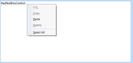 public partial class RadForm1 : Telerik.WinControls.UI.RadForm{ public RadForm1() { TextBoxControlLocalizationProvider.CurrentProvider = new MyTextBoxControlLocalizationProvider(); InitializeComponent(); }}public class MyTextBoxControlLocalizationProvider : TextBoxControlLocalizationProvider{ public override string GetLocalizedString(string id) { switch (id) { case TextBoxControlStringId.ContextMenuCopy: return "&Copy"; case TextBoxControlStringId.ContextMenuCut: return "Cu&t"; case TextBoxControlStringId.ContextMenuPaste: return "&Paste"; case TextBoxControlStringId.ContextMenuDelete: return "&Delete"; case TextBoxControlStringId.ContextMenuSelectAll: return "&Select All"; } return base.GetLocalizedString(id); }}I hope this will help. Let me know if you have other questions.