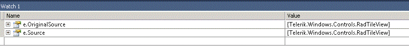 <telerikNavigation:RadTileView TileStateChanged="RadTileView_TileStateChanged"> <telerikNavigation:RadTileViewItem Header="Item 0" /> <telerikNavigation:RadTileViewItem Header="Item 1" /> <telerikNavigation:RadTileViewItem Header="Item 2" /> <telerikNavigation:RadTileViewItem Header="Item 3" /></telerikNavigation:RadTileView>private void RadTileView_TileStateChanged(object sender, Telerik.Windows.RadRoutedEventArgs e){ // here e.Source is RadTileViewItem and e.OriginalSource is RadTileViewItem}However, since you are binding RadTileView, the e.Source will be RadTileView, while the e.OriginalSource will be RadTileViewItem.