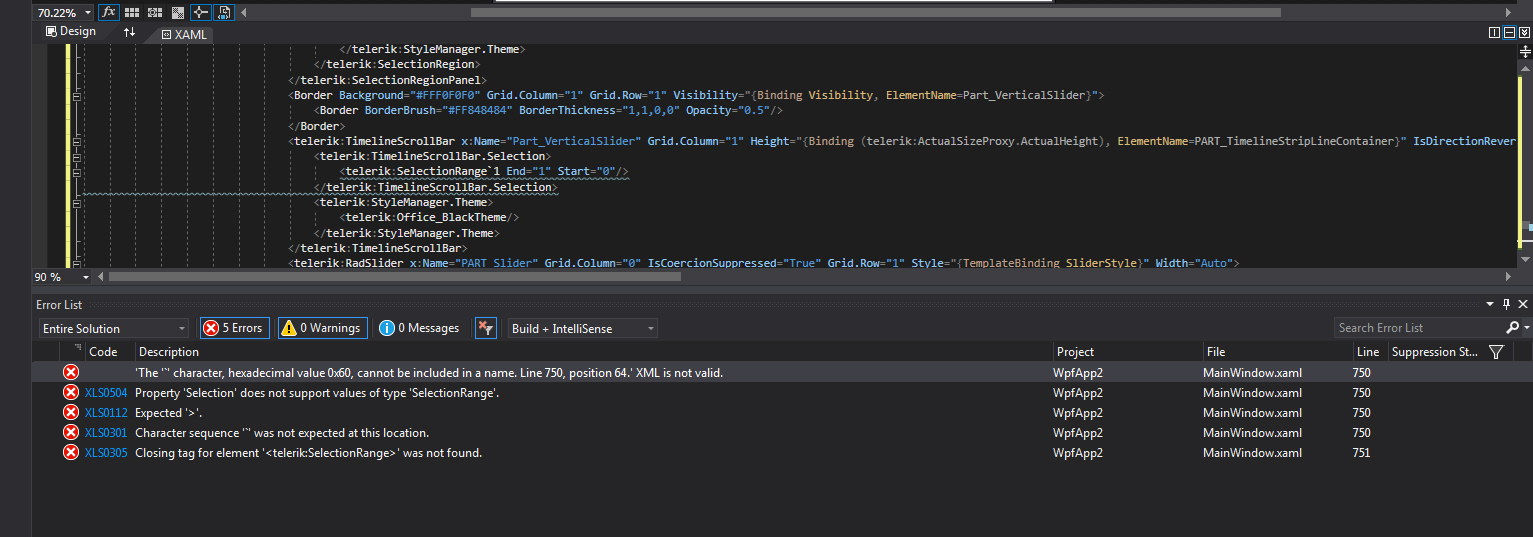 The reason behind this exception is that VS doesn't extract the SelectionRange property of the TimelineScrollBar correctly. Can you try to remove the setter of this property from the XAML template?