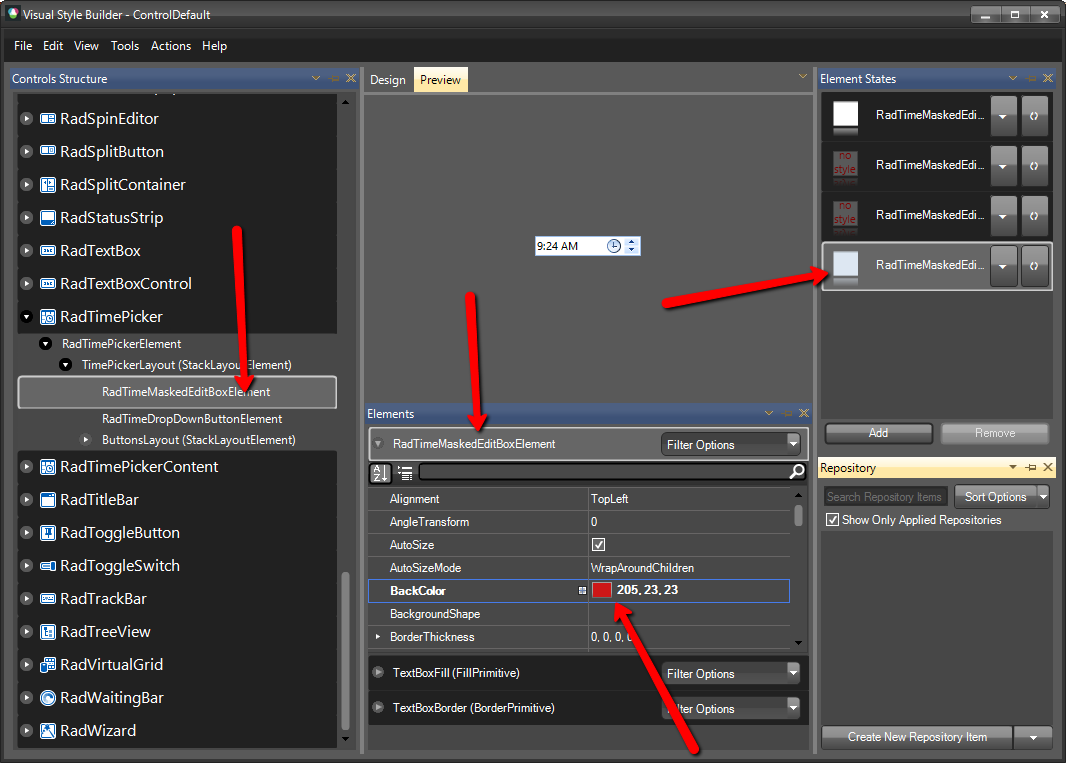Please see the attached picture. Notice how the RadDateTimePicker control (on the left) has the expected disabled appearance. However, the RadTimePicker control (on the right) does not. Specifically, part of the RadTimePicker editor background is still drawn in a light color when the control is disabled.