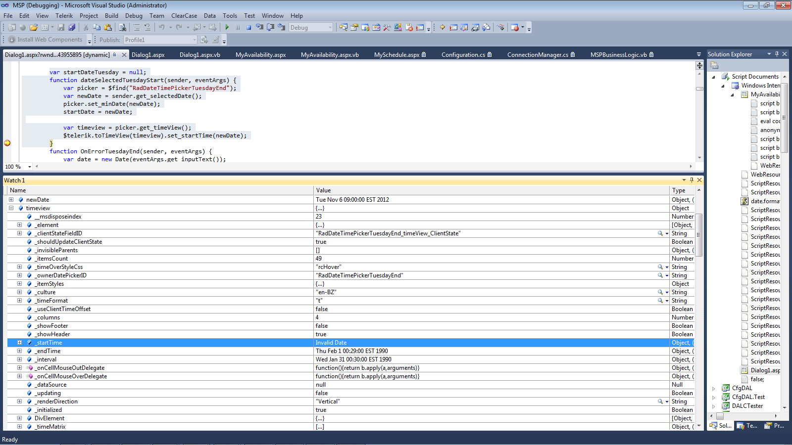 Date myDate = new Date(year, month, day, hours, minutes, seconds, milliseconds)Telerik merely seperates each of these distinct values by a hyphen '-'. You need to modify your newDate variable when calling set_startTime() the same way I do in my checkStartDate method by formatting it with the hyphen between each part of the date/time.