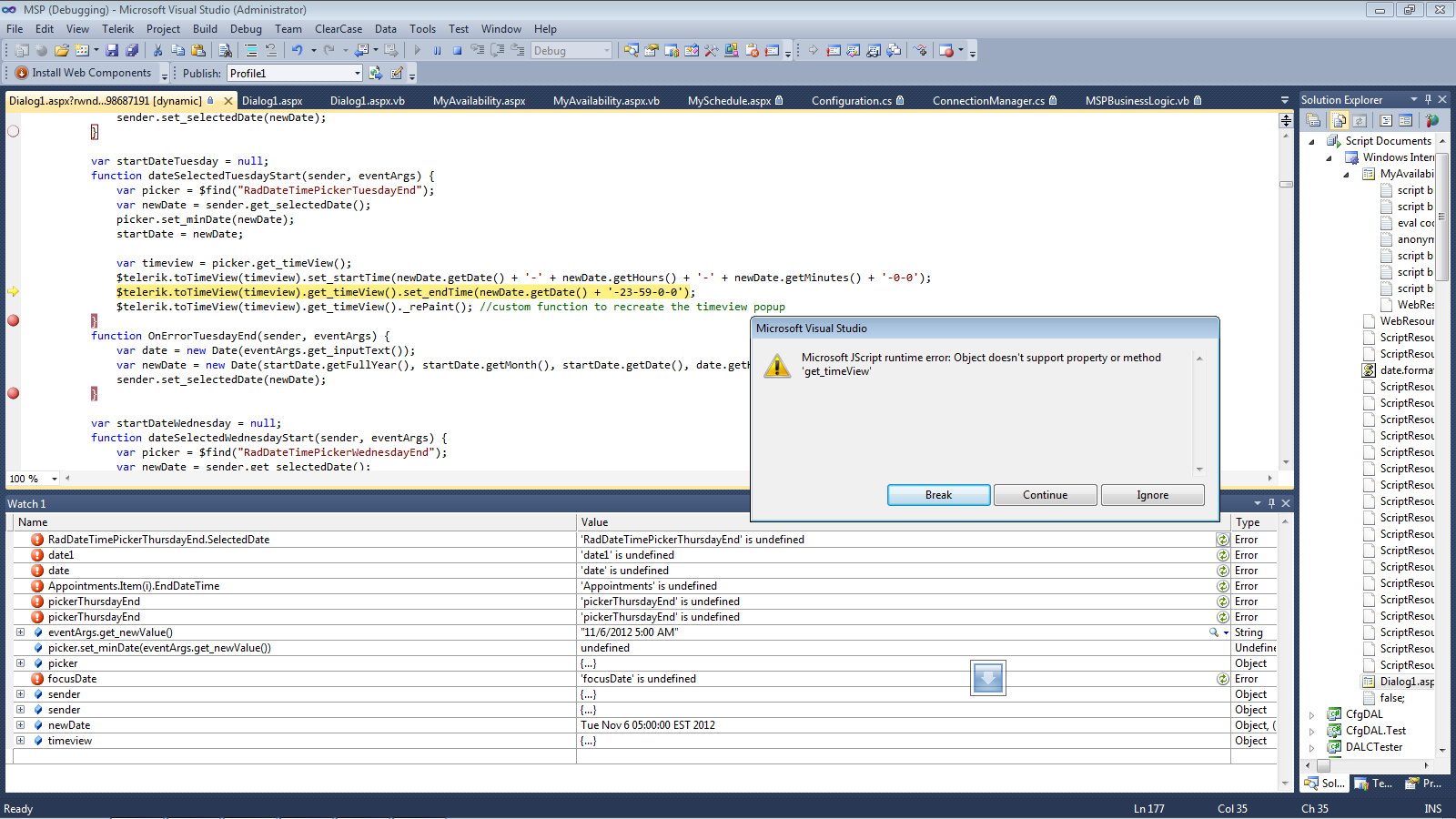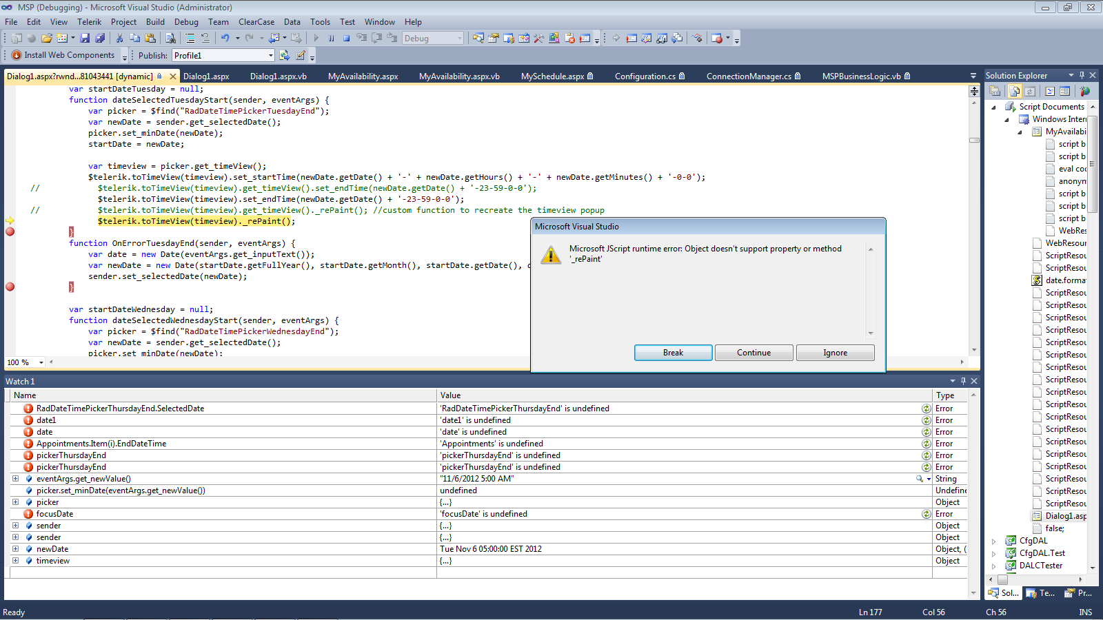 function checkStartDate(sender, args){ var endDate = $find('<%= PickerEnd.ClientID %>'); if(!endDate) // PickerEnd has been hidden. return; var newDate = new Date(args.get_newDate()); endDate.get_timeView().set_startTime(newDate.getDate() + '-' + newDate.getHours() + '-' + newDate.getMinutes() + '-0-0'); endDate.get_timeView().set_endTime(newDate.getDate() + '-23-59-0-0'); endDate.get_timeView()._rePaint(); //custom function to recreate the timeview popup}This attempts to use whatever you have in the template (if any) defined in the control. If there's a problem finding the time's text because of custom templates, modify the find selector in the following line in the _rePaint method in order to find that text: