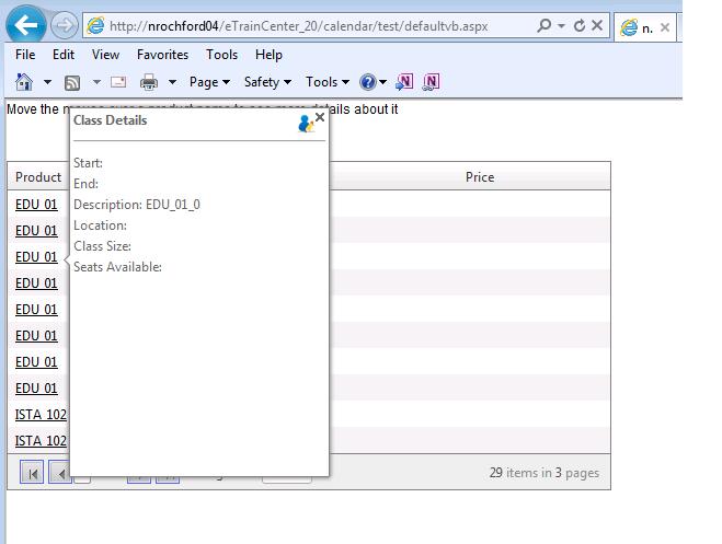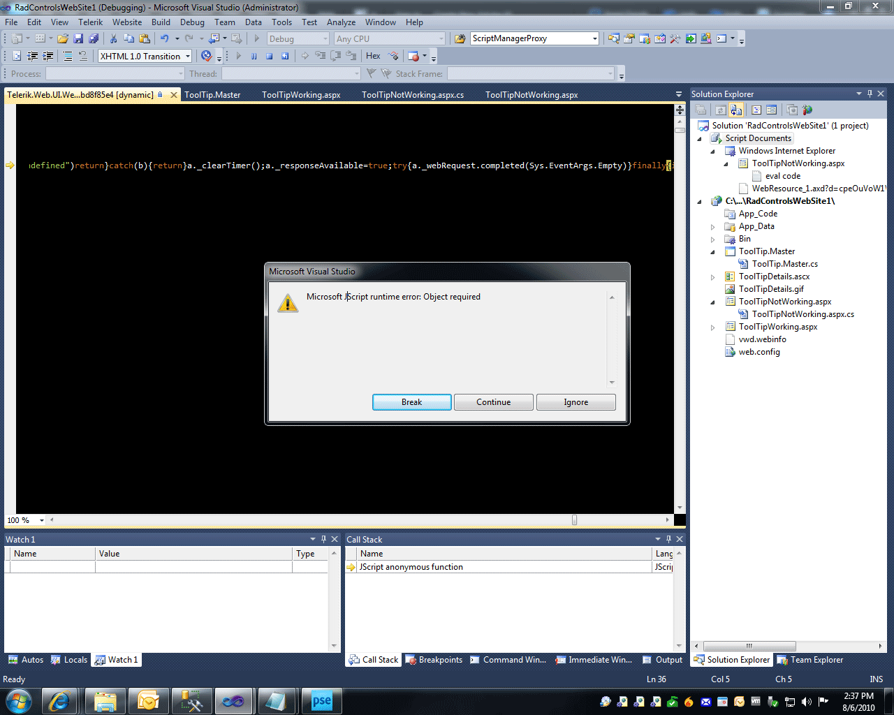 I have a project. Attached. In this project I have one page that does not use master page and I have another that does. Within each page I have an image in which I want to show details using a ToolTip. One the page working I have the image as a single image. On the page not working I have the image repeated (and data bound) to a RadGrid. The page using master Page is failing when I hover over the image which in turn triggers the tool tip.