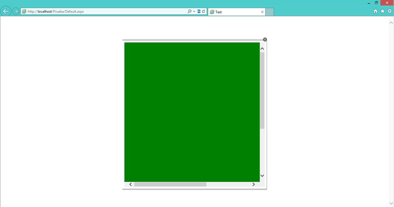 <%@ Page Language="C#" AutoEventWireup="true" CodeFile="Default.aspx.cs" Inherits="_Default" %><%@ Register Assembly="Telerik.Web.UI" Namespace="Telerik.Web.UI" TagPrefix="telerik" %><!DOCTYPE html><html xmlns="http://www.w3.org/1999/xhtml"><head runat="server"> <title>Test</title></head><body> <form id="form1" runat="server"> <telerik:RadScriptManager ID="RadScriptManager1" runat="server"> </telerik:RadScriptManager> <div> <telerik:RadToolTip ID="RadToolTip1" runat="server" ContentScrolling="Both" Height="500px" Position="Center" RelativeTo="BrowserWindow" VisibleOnPageLoad="True" Width="500px" ManualClose="True"> <table style="width: 750px; height: 750px; background-color: #008000;"> <tr> <td style="width: 750px; height: 750px; background-color: #008000;"></td> </tr> </table> </telerik:RadToolTip> </div> </form></body></html>In Internet Explorer 10 (With compatibility mode) it shows the scrolls, but (With out compatibility) it dosen't show the scrolls.