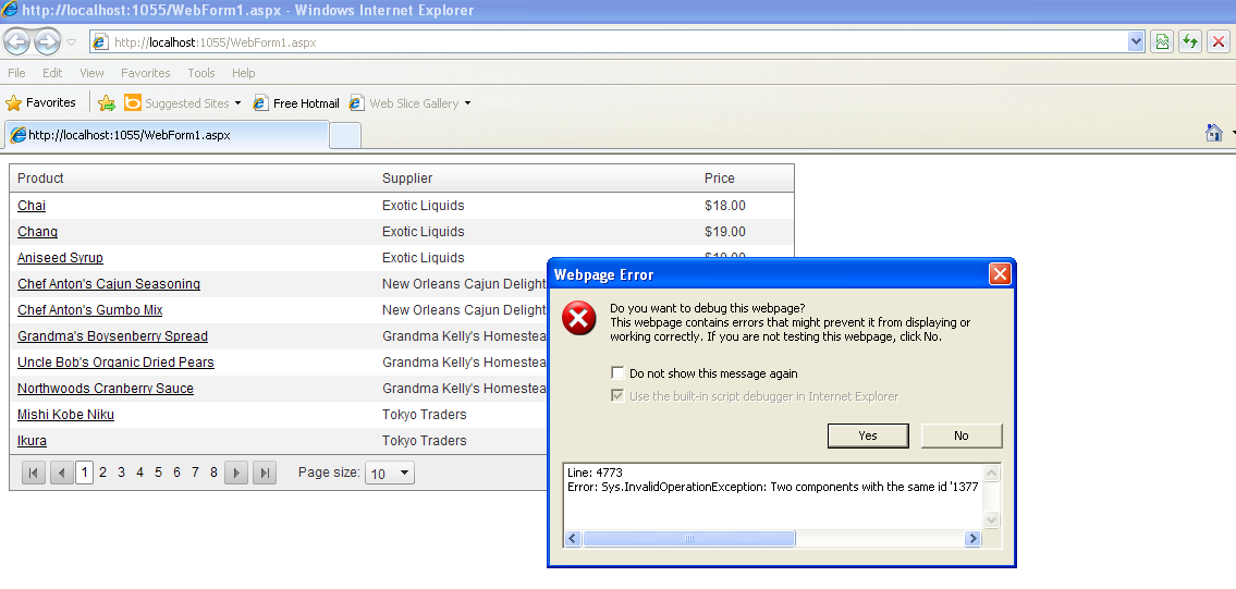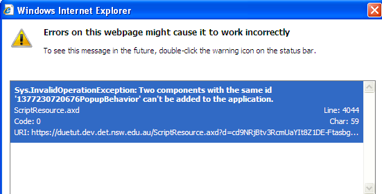 When EnableAriaSupport=true is set in the RadToolTipManager, I am getting "Sys.InvalidOperationException: Two components with the same id 'xxxPopupBehaviour' can't be added to the application" java script error message in IE8 with XP (see attached jserror.png for more details). When I set EnableAriaSupport=false, I don't see any java script error messages.