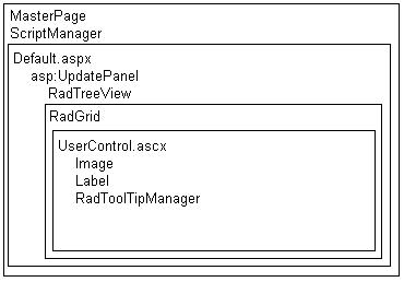 Here is my situation, I have a UserControl that has a simple Image, Label and a RadToolTipManager that gets the tooltip info via a WebService for both the Image and the Label. This UserControl is used on a RadGrid that goes inside an asp:UpdatePanel on a page Default.aspx. Inside the UpdatePanel I also have a RadTreeView that updates the content of the Grid on the onNodeClick event and the Default.aspx implements a MasterPage that has the asp:ScriptManager.