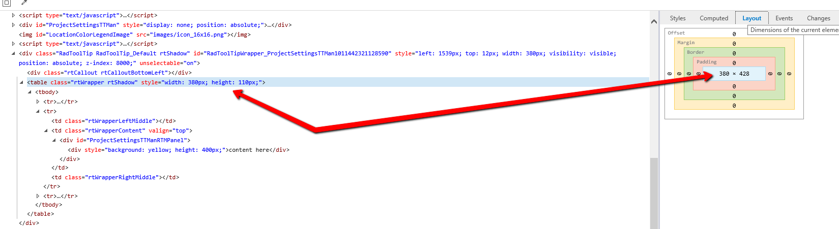 and before that had: .RadToolTip .rtWrapper .rtWrapperContent {height: 100px !important;}