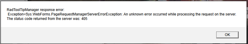 Exception=Sys.WebForms.PageRequestManagerServerErrorException: An unknown error occurred while processing the request on the server. The status code returned from the server was: 405