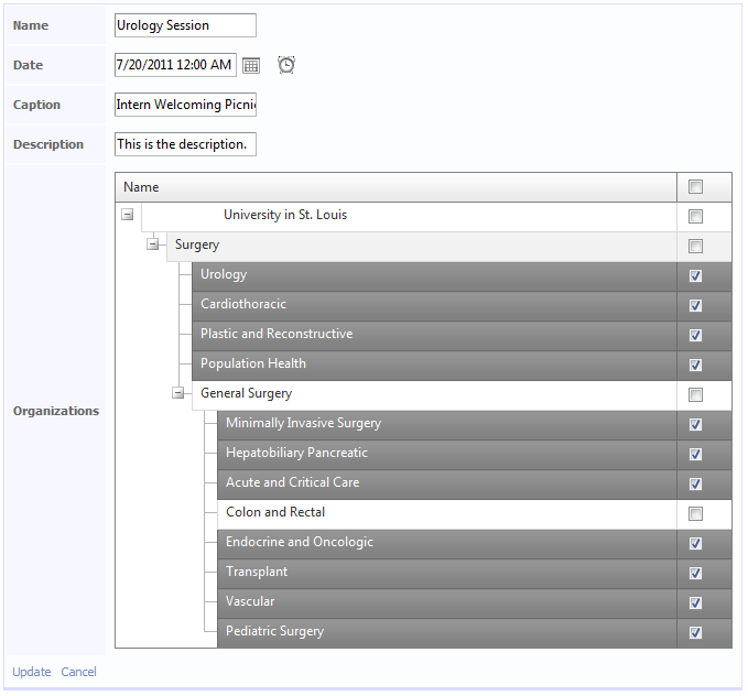 <%@ Control Language="C#" CodeBehind="ManyToMany_Edit.ascx.cs" Inherits="Ctp.U.Web.ResidentPortal.Forms.ManyToMany_EditField" %><%@ Register Assembly="Telerik.Web.UI" Namespace="Telerik.Web.UI" TagPrefix="telerik" %><telerik:RadTreeList ID="_radTreeList1" runat="server" OnDataBound="_radTreeList1_DataBound"></telerik:RadTreeList>using System;using System.Collections;using System.ComponentModel;using System.Data.Objects;using System.Data.Objects.DataClasses;using System.Web.DynamicData;using System.Web.UI;using System.Web.UI.WebControls;using Telerik.Web.UI;namespace Ctp.U.Web.ResidentPortal.Forms{ public partial class ManyToMany_EditField : System.Web.DynamicData.FieldTemplateUserControl { public void Page_Load(object sender, EventArgs e) { // Register for the DataSource's updating event EntityDataSource ds = (EntityDataSource)this.FindDataSourceControl(); // This field template is used both for Editing and Inserting ds.Updating += new EventHandler<EntityDataSourceChangingEventArgs>(DataSource_UpdatingOrInserting); ds.Inserting += new EventHandler<EntityDataSourceChangingEventArgs>(DataSource_UpdatingOrInserting); } void DataSource_UpdatingOrInserting(object sender, EntityDataSourceChangingEventArgs e) { MetaTable childTable = ChildrenColumn.ChildTable; // Comments assume employee/territory for illustration, but the code is generic // Get the collection of territories for this employee RelatedEnd entityCollection = (RelatedEnd)Column.EntityTypeProperty.GetValue(e.Entity, null); // In Edit mode, make sure it's loaded (doesn't make sense in Insert mode) if (Mode == DataBoundControlMode.Edit && !entityCollection.IsLoaded) { entityCollection.Load(); } // Get an IList from it (i.e. the list of territories for the current employee) // REVIEW: we should be using EntityCollection directly, but EF doesn't have a // non generic type for it. They will add this in vnext IList entityList = ((IListSource)entityCollection).GetList(); // Go through all the territories (not just those for this employee) foreach (object childEntity in childTable.GetQuery(e.Context)) { // Check if the employee currently has this territory bool isCurrentlyInList = entityList.Contains(childEntity); // Find the checkbox for this territory, which gives us the new state string pkString = childTable.GetPrimaryKeyString(childEntity); //ListItem listItem = CheckBoxList1.Items.FindByValue(pkString); TreeListDataItem radItem = null; foreach (TreeListDataItem item in _radTreeList1.Items) { if (item["Id"].Text == pkString) radItem = item; } if (radItem == null) continue; // If the states differs, make the appropriate add/remove change if (radItem.Selected) { if (!isCurrentlyInList) entityList.Add(childEntity); } else { if (isCurrentlyInList) entityList.Remove(childEntity); } } } protected void DataBound() { MetaTable childTable = ChildrenColumn.ChildTable; // Comments assume employee/territory for illustration, but the code is generic IList entityList = null; ObjectContext objectContext = null; if (Mode == DataBoundControlMode.Edit) { object entity; ICustomTypeDescriptor rowDescriptor = Row as ICustomTypeDescriptor; if (rowDescriptor != null) { // Get the real entity from the wrapper entity = rowDescriptor.GetPropertyOwner(null); } else { entity = Row; } // Get the collection of territories for this employee and make sure it's loaded RelatedEnd entityCollection = Column.EntityTypeProperty.GetValue(entity, null) as RelatedEnd; if (entityCollection == null) { throw new InvalidOperationException(String.Format("The ManyToMany template does not support the collection type of the '{0}' column on the '{1}' table.", Column.Name, Table.Name)); } if (!entityCollection.IsLoaded) { entityCollection.Load(); } // Get an IList from it (i.e. the list of territories for the current employee) // REVIEW: we should be using EntityCollection directly, but EF doesn't have a // non generic type for it. They will add this in vnext entityList = ((IListSource)entityCollection).GetList(); // Get the current ObjectContext // REVIEW: this is quite a dirty way of doing this. Look for better alternative ObjectQuery objectQuery = (ObjectQuery)entityCollection.GetType().GetMethod( "CreateSourceQuery").Invoke(entityCollection, null); objectContext = objectQuery.Context; } // Go through all the territories (not just those for this employee) foreach (object childEntity in childTable.GetQuery(objectContext)) { _radTreeList1.DataKeyNames = new string[] { "Id" }; _radTreeList1.ParentDataKeyNames = new string[] { "ParentId" }; TreeListDataItem radItem = new TreeListDataItem(_radTreeList1 , TreeListItemType.Item , _radTreeList1.Items.Count , true); radItem.DataItem = childEntity; // Make it selected if the current employee has that territory if (Mode == DataBoundControlMode.Edit) { radItem.Selected = entityList.Contains(childEntity); } _radTreeList1.Items.Add(radItem); } } protected void _radTreeList1_DataBound(object sender, EventArgs e) { DataBound(); } public override Control DataControl { get { return _radTreeList1; } } }}