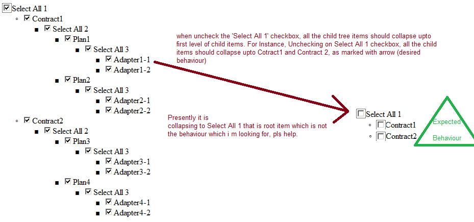 <script type="text/javascript"> function OnClientNodeChecked(sender, args) { if (args.get_node().get_text() == "Select All 1") { if (args.get_node().get_checked()) { args.get_node().expand(); var nodes = args.get_node().get_allNodes(); var nodeCount = nodes.length; for (var counter = 0; counter < nodeCount; counter++) { nodes[counter].expand(); nodes[counter].set_checked(true); } } else { var nodes = args.get_node().get_allNodes(); var nodeCount = nodes.length; for (var counter = 0; counter < nodeCount; counter++) { nodes[counter].collapse(); nodes[counter].set_checked(false); } } } }</script>Thanks,