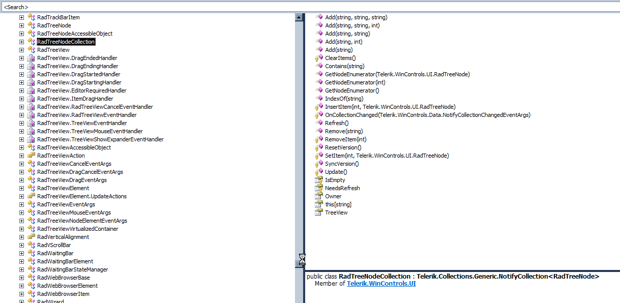 I've downloaded trial version of Telerik controls for WinForms mainly to verify if RadTreeView contains required functionality. After playing around for a while I've noticed that it doesn't have couple of methods that are documented in Telerik site: