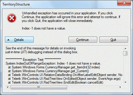 With AllowEdit=True, I press F2, and edit the text. Then when I hit the enter or escape key, the radtreeview crashes with the an exception "Index -1 does not have a value". See attached file radtreeviewError1.gif