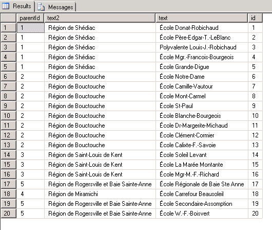 <telerik:RadScriptManager runat="server" ID="RadScriptManager1" /> <telerik:RadTreeView runat="server" ID="RadTreeView1" DataSourceID="SqlDataSource1" DataFieldID="id" DataFieldParentID="parentID" CheckBoxes="true"> <DataBindings> <telerik:RadTreeNodeBinding TextField="Text" /> <telerik:RadTreeNodeBinding Depth="0" Checkable="false" TextField="Text2" Expanded="true" /> </DataBindings> </telerik:RadTreeView> <asp:SqlDataSource runat="server" ID="SqlDataSource1" ConnectionString="<%$ ConnectionStrings:xxxx%>" SelectCommand="uspListRegionEcole" SelectCommandType="StoredProcedure" />