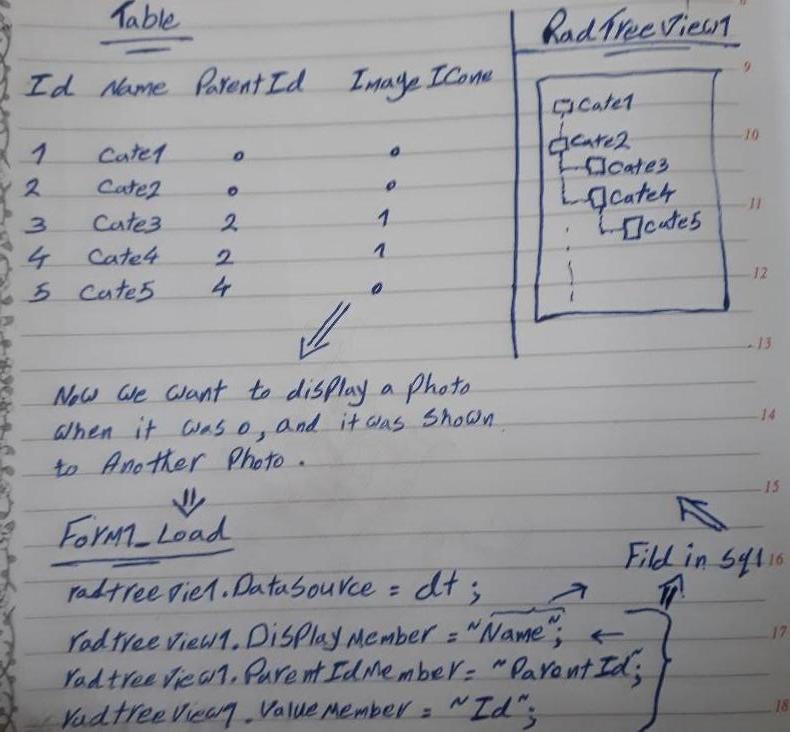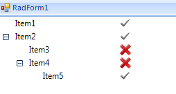 private void RadForm1_Load(object sender, EventArgs e){ DataTable dt = new DataTable(); dt.Columns.Add("Id", typeof(int)); dt.Columns.Add("Name", typeof(string)); dt.Columns.Add("ParentId", typeof(int)); dt.Columns.Add("ImageIcon", typeof(int)); dt.Rows.Add(1, "Item1", 0, 0); dt.Rows.Add(2, "Item2", 0, 0); dt.Rows.Add(3, "Item3", 2, 1); dt.Rows.Add(4, "Item4", 2, 1); dt.Rows.Add(5, "Item5", 4, 0); this.radTreeView1.NodeFormatting += radTreeView1_NodeFormatting; this.radTreeView1.DisplayMember = "Name"; this.radTreeView1.ParentMember = "ParentId"; this.radTreeView1.ChildMember = "Id"; this.radTreeView1.DataSource = dt;}private void radTreeView1_NodeFormatting(object sender, Telerik.WinControls.UI.TreeNodeFormattingEventArgs e){ DataRowView rowView = e.Node.DataBoundItem as DataRowView; if (rowView!=null) { if ((int)rowView.Row["ImageIcon"] == 0) { e.NodeElement.Image = Properties.Resources.check; } else { e.NodeElement.Image = Properties.Resources.remove; } }}I hope this information helps. If you have any additional questions, please let me know.