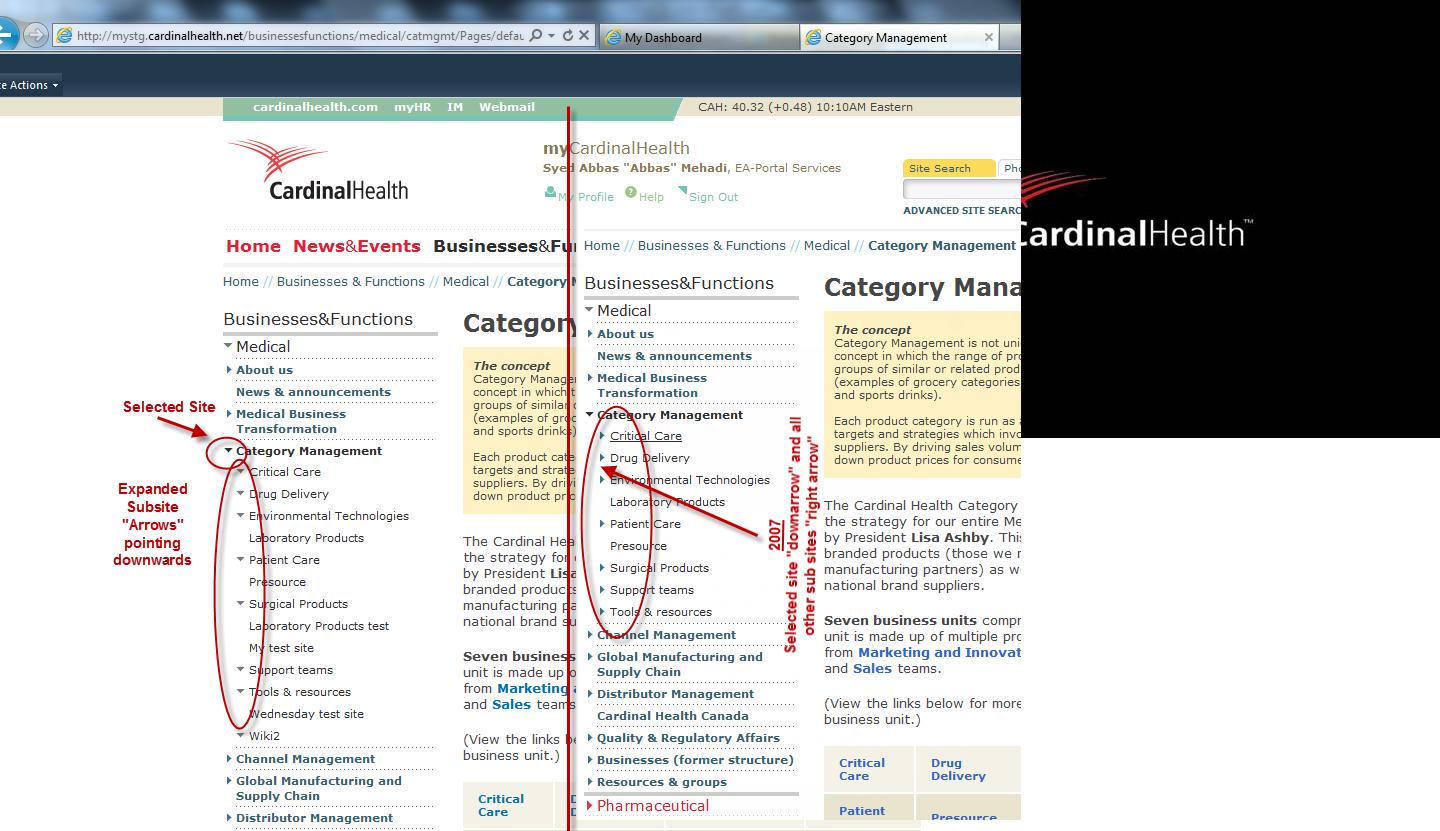 The problem is that the arrows that it has on the left, ( see attached image please), sometimes those arrows are pointing in a right direction ( right for the subsites of the site that im visiting ) , but in some other sites, the arrows wiill not show up correctly. This is all in the same site collection.