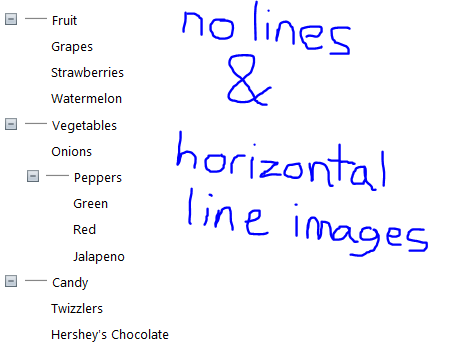 <telerik:RadTreeView ID="RadTreeView1" Runat="server" ShowLineImages="False" Skin="WebBlue"> <Nodes> <telerik:RadTreeNode runat="server" Text="Fruit" ImageUrl="http://upload.wikimedia.org/wikipedia/commons/6/68/Treeview-grey-horizontal-line.png"> <Nodes> <telerik:RadTreeNode runat="server" Text="Grapes"> </telerik:RadTreeNode> <telerik:RadTreeNode runat="server" Text="Strawberries"> </telerik:RadTreeNode> <telerik:RadTreeNode runat="server" Text="Watermelon"> </telerik:RadTreeNode> </Nodes> </telerik:RadTreeNode> <telerik:RadTreeNode runat="server" Text="Vegetables" ImageUrl="http://upload.wikimedia.org/wikipedia/commons/6/68/Treeview-grey-horizontal-line.png"> <Nodes> <telerik:RadTreeNode runat="server" Text="Onions"> </telerik:RadTreeNode> <telerik:RadTreeNode runat="server" Text="Peppers" ImageUrl="http://upload.wikimedia.org/wikipedia/commons/6/68/Treeview-grey-horizontal-line.png"> <Nodes> <telerik:RadTreeNode runat="server" Text="Green"> </telerik:RadTreeNode> <telerik:RadTreeNode runat="server" Text="Red"> </telerik:RadTreeNode> <telerik:RadTreeNode runat="server" Text="Jalapeno"> </telerik:RadTreeNode> </Nodes> </telerik:RadTreeNode> </Nodes> </telerik:RadTreeNode> <telerik:RadTreeNode runat="server" BackColor="White" ImageUrl="http://upload.wikimedia.org/wikipedia/commons/6/68/Treeview-grey-horizontal-line.png" Text="Candy"> <Nodes> <telerik:RadTreeNode runat="server" Text="Twizzlers"> </telerik:RadTreeNode> <telerik:RadTreeNode runat="server" Text="Hershey's Chocolate"> </telerik:RadTreeNode> </Nodes> </telerik:RadTreeNode> </Nodes> </telerik:RadTreeView>Hopefully my example could be of some help to you.