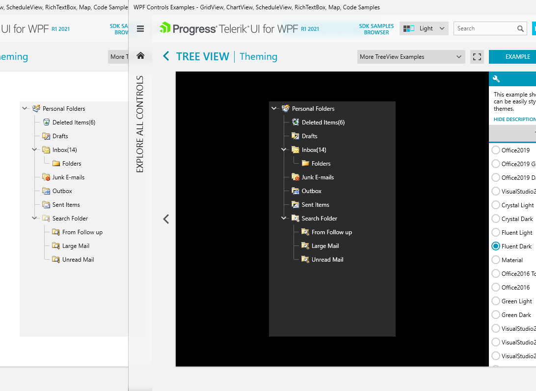 </Style>This will result to (Fluent Light theme on the left, Fluent Dark on the right with an AlternativeBrush as the RadTreeView's background):