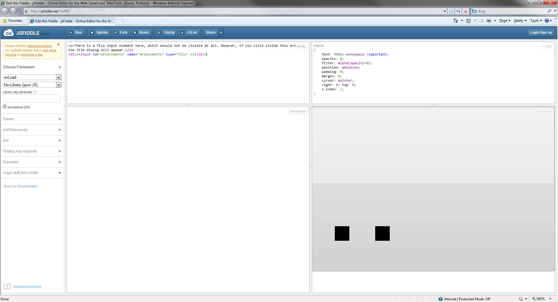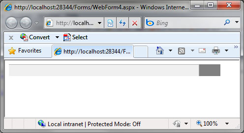 <%@ Page Language="C#" AutoEventWireup="true" CodeBehind="Default.aspx.cs" Inherits="Default" %> <!DOCTYPE html PUBLIC "-//W3C//DTD XHTML 1.0 Transitional//EN" "http://www.w3.org/TR/xhtml1/DTD/xhtml1-transitional.dtd"> <html xmlns="http://www.w3.org/1999/xhtml"> <head runat="server"> <title></title> <telerik:RadStyleSheetManager id="RadStyleSheetManager1" runat="server" /> </head> <body> <form id="form1" runat="server"> <telerik:RadScriptManager ID="RadScriptManager1" runat="server"> <Scripts> <%--Needed for JavaScript IntelliSense in VS2010--%> <%--For VS2008 replace RadScriptManager with ScriptManager--%> <asp:ScriptReference Assembly="Telerik.Web.UI" Name="Telerik.Web.UI.Common.Core.js" /> <asp:ScriptReference Assembly="Telerik.Web.UI" Name="Telerik.Web.UI.Common.jQuery.js" /> <asp:ScriptReference Assembly="Telerik.Web.UI" Name="Telerik.Web.UI.Common.jQueryInclude.js" /> </Scripts> </telerik:RadScriptManager> <script type="text/javascript"> //Put your JavaScript code here. </script> <telerik:RadAjaxManager ID="RadAjaxManager1" runat="server"> </telerik:RadAjaxManager> <div> <telerik:RadUpload ID="RadUpload1" Runat="server" InputSize="57"> </telerik:RadUpload> <telerik:RadUpload ID="RadUpload2" Runat="server" InputSize="58"> </telerik:RadUpload> </div> </form> </body> </html>Thanks for pointing this to us. I've forwarded to our QA, however, at least on my machine I was not able to reproduce it. It seems that there it is a combination of IE security settings and configuration of RadUpload that is triggering the problem.