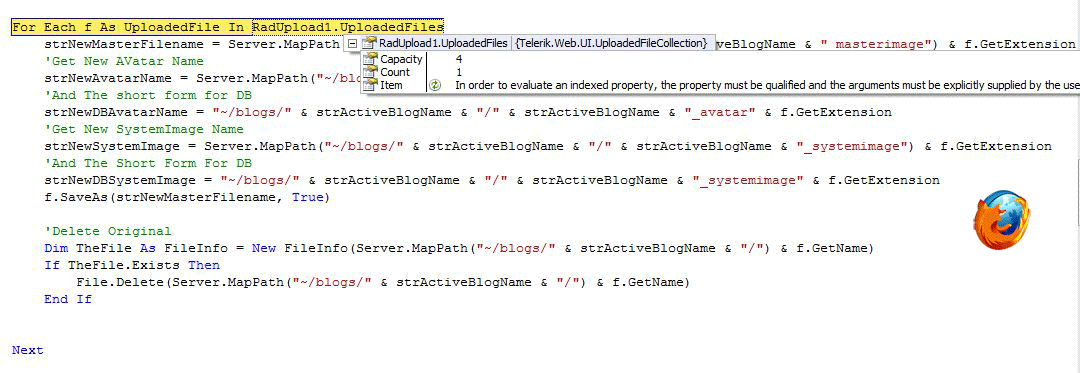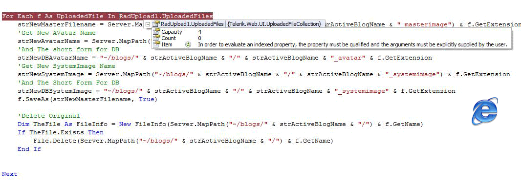f.SaveAs(strNewMasterFilename, True)NextSo Basically the radupload1.uploadedfiles collection is returning null in IE, and the correct value in Firefox (also works fine in Opera)