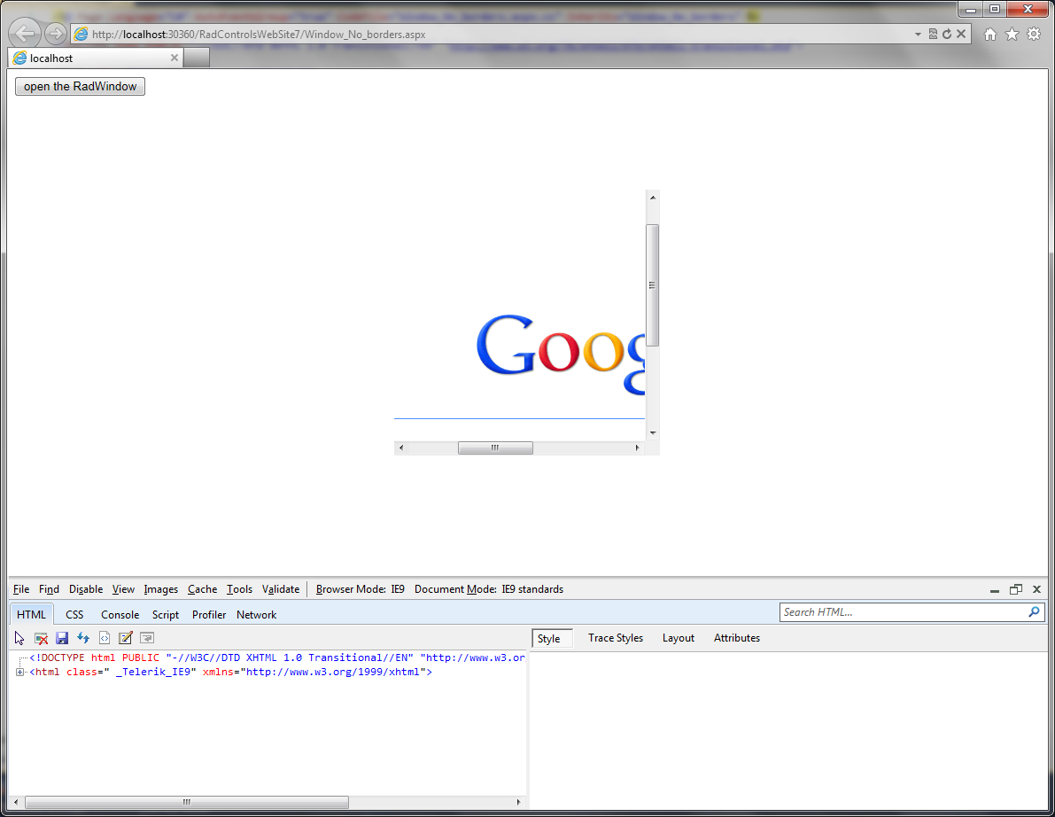 I am also attaching a simple page which removes the borders correctly. You can confirm this in the attached screenshot as well. Please make sure that the skin set to the RadWindow is the same as the one used in the CSS selectors. In my example this is the Sunset skin, if you are using a different one you would need to replace Sunset with your skin name.