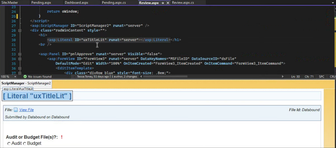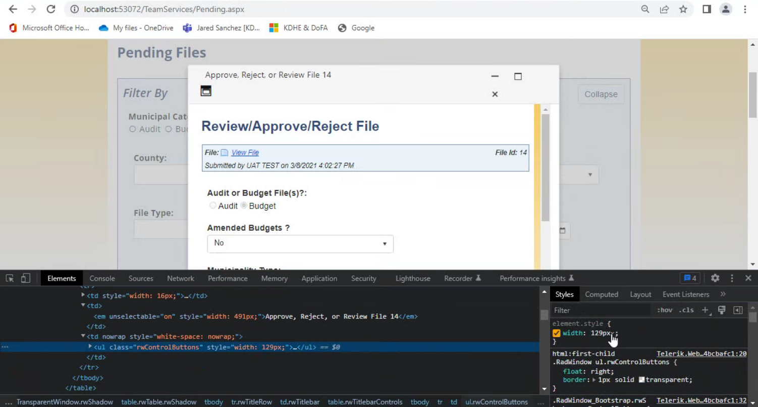 The button redirects to the pop up/RadWindow is the Review.Aspx page, the Pending.aspx is the page which has the button to click generating the Review page in question.