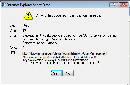 <telerik:RadWindowManager ID="RadWindows" runat="server" Skin="Web20" Behaviors="Close,Move,Resize"> <Windows> <telerik:RadWindow Height="362" Width="504" ID="ViewWindow" OnClientClose="updateRadGrid" RegisterWithScriptManager="false" runat="server" CssClass="actionWindow" NavigateUrl="UserEditor.aspx" VisibleStatusbar="false" VisibleTitlebar="true" ReloadOnShow="true"> </telerik:RadWindow> </Windows> </telerik:RadWindowManager> <telerik:RadCodeBlock ID="RadCodeBlock1" runat="server"> <script type="text/javascript"> //View USER function showUserViewerWindow(userId) { var actionWindow = $find("<%=ViewWindow.ClientID %>"); actionWindow.setUrl("UserViewer.aspx?userId=" + userId); actionWindow.show(); } //UPDATEGRID function updateRadGrid(sender, eventArgs) { var ajaxManager = $find("<%= RadAjaxManager.GetCurrent(Page).ClientID %>"); ajaxManager.ajaxRequestWithTarget("<%= RefreshList.UniqueID%>"); } </script> </telerik:RadCodeBlock>I have attached alerts to the $find function and I keep getting a null value in IE6, a problem I'm not encountering in any other browsers. Ultimately, Im trying to resize the windows specifically for IE because Autosize ="true" always results in scrollbars. I have attached a screen capture of the script error I'm receiving.