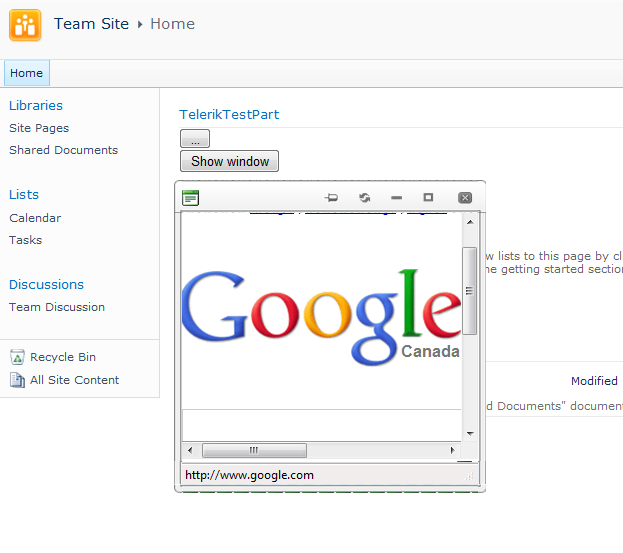 protected override void CreateChildControls() { Button submitButton = new Button(); submitButton.Text = "Show window"; submitButton.ID = "popupButton"; Controls.Add(submitButton); popupWindow = new RadWindow(); popupWindow.OpenerElementID = submitButton.ClientID; popupWindow.NavigateUrl = "http://www.google.com"; Controls.Add(popupWindow); base.CreateChildControls(); }I need the window to act as a modal dialog and inherit SharePoint's look and feel, so that the window matches the rest of SharePoint. As an example, one of SharePoint 2010's dialogs is attached: sharepoint_ss.png.