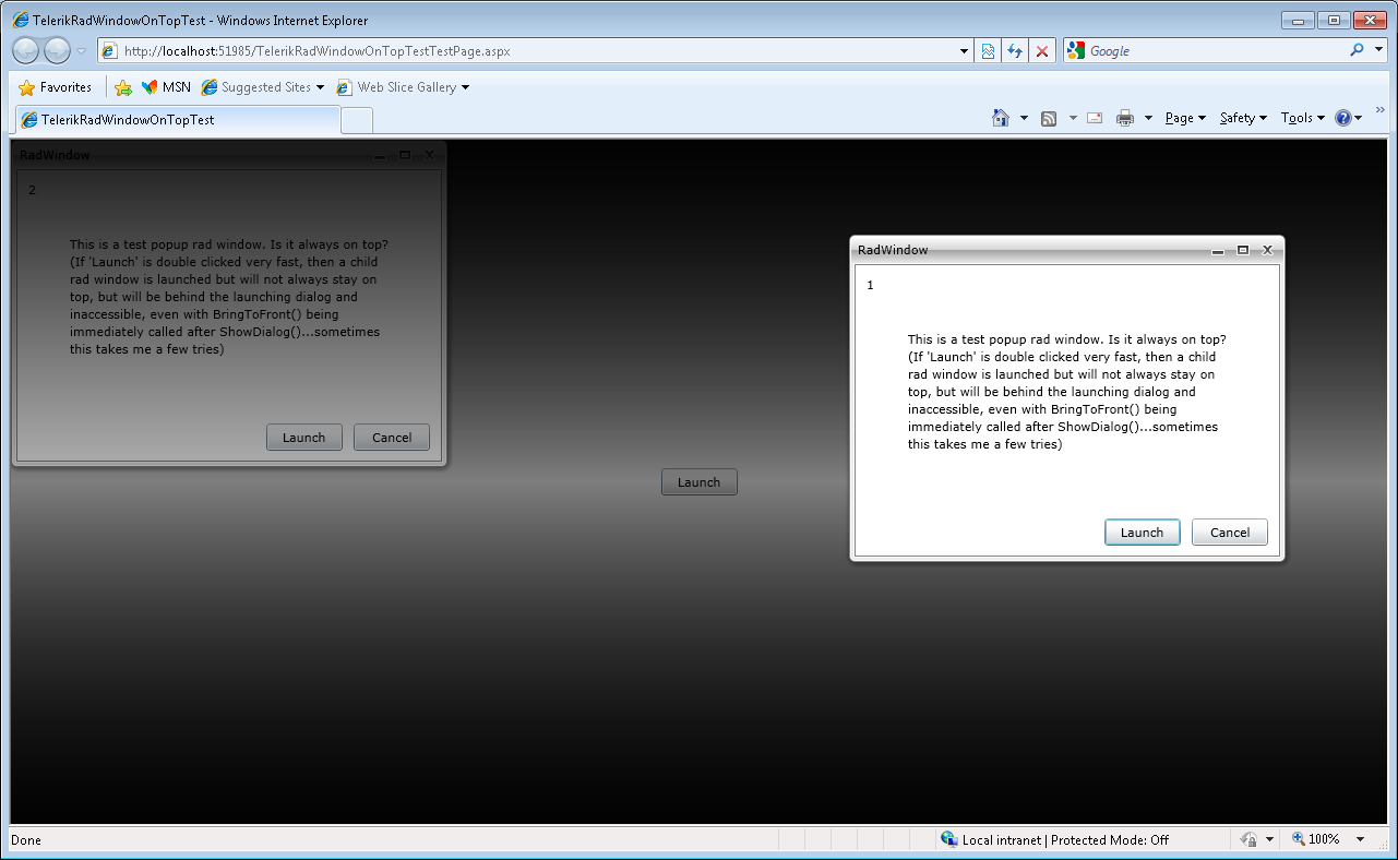 All that the button handler code does is instantiate the rad window, call ShowDialog() and even BringToFront(). (I've tried with/without BringToFront() call). It seems as though the second button click is being processed before the child window's lock down is performed, giving focus and accessibility back to the parent window...