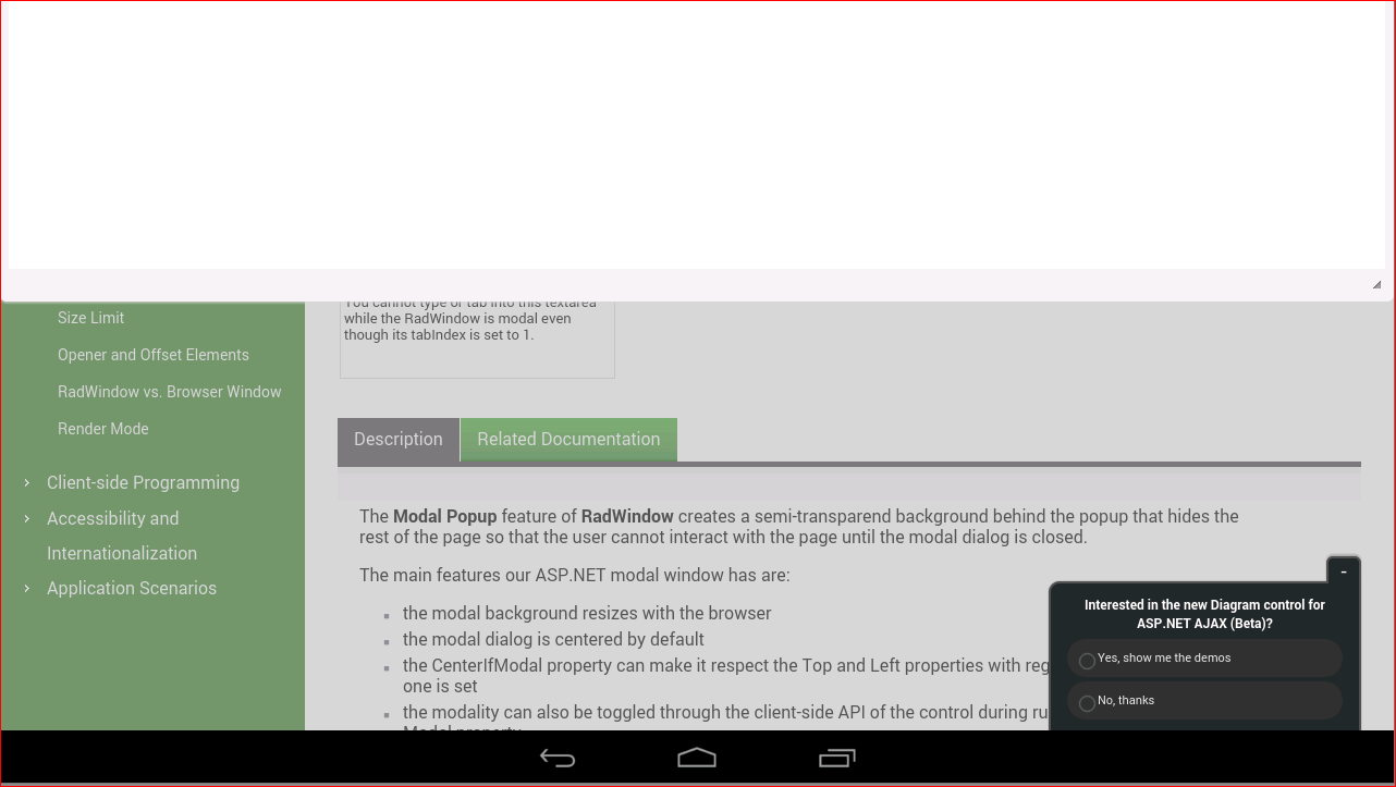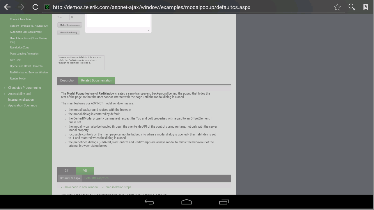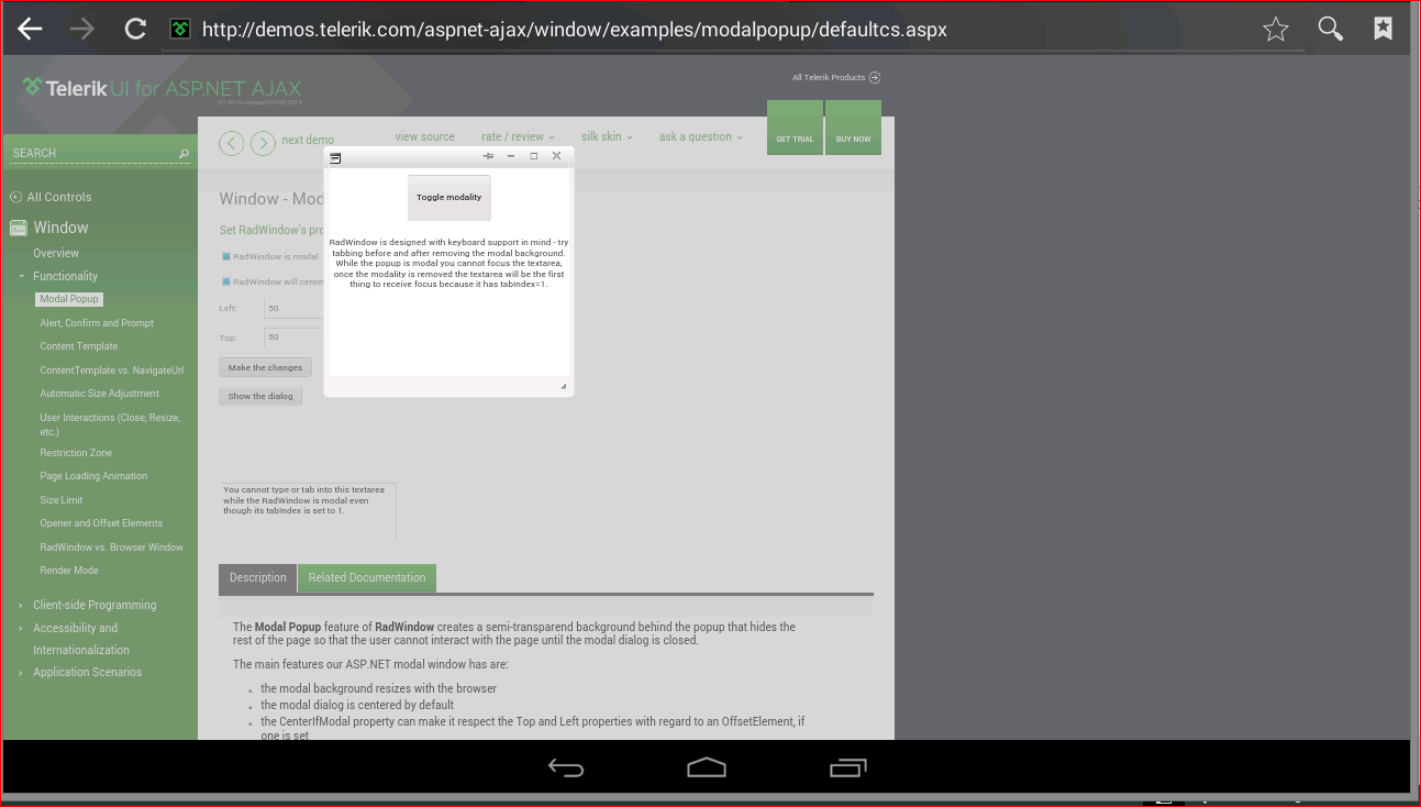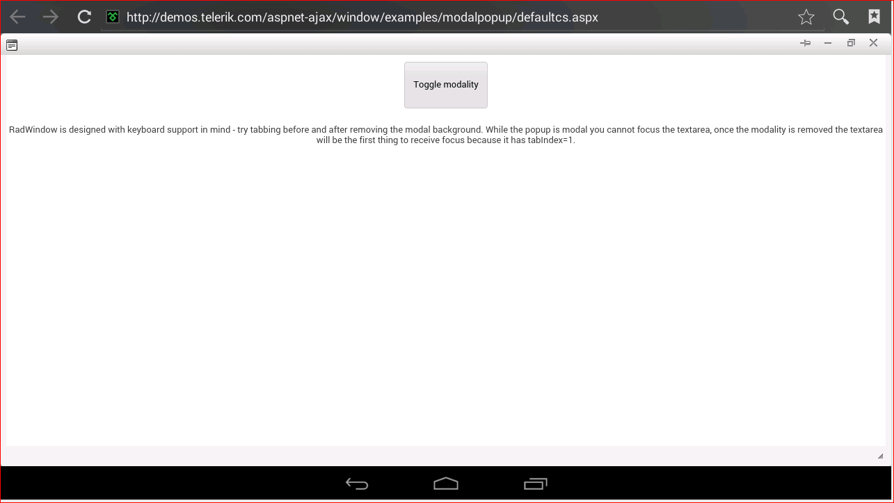 It is simple scenario. We have page and RadWindow. Let's say there is just button to open modal maximized window. It works. But you can use touch and move with overlay below window. The same issue is on demo page http://demos.telerik.com/aspnet-ajax/window/examples/modalpopup/defaultcs.aspx. Navigate to this page in any Android browser (I think the same is in IE on Windows Phone or Chrome on Android), set window as modal and maximize it. Then simply drag upwards and window "floats" away and you will see page with overflow.