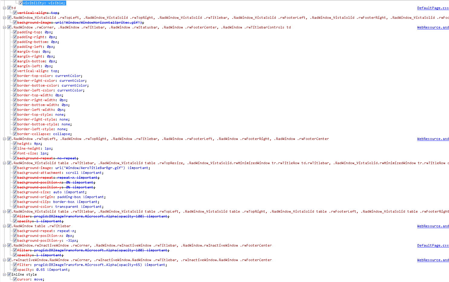 I am using the Vista skin for the framework to our radWindows. However my boss doesn't like the fact that you can see through the framwork of the window to the page beneath it in the z-order. I have tried overriding the css in my own file but for some reason the opacity values have been set to !important in the embedded versions css (the one that comes from WebResourse.axd) and this always seems to take priority. So I thought I would get round this by using the online sylebuilder, grab a copy of the Vista skin call it VistaSolid, Edit the opacity values for the Window.VistaSolid.css, attach the css file to calling page and set the EnableEmbbededSkins to false for the RadWindowManager. This should have resulted in the opacity being no longer see through, however it doesn't. although the new custom skin is being used and many of the attributes are collected from there the opacity values are still coming from WebResource.axd, which they shouldn't be.
