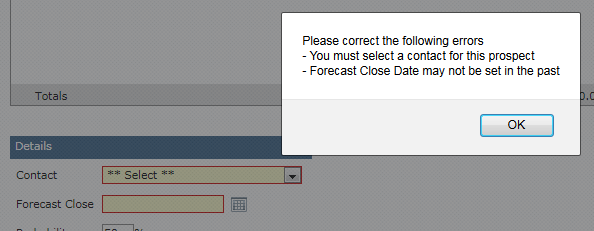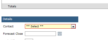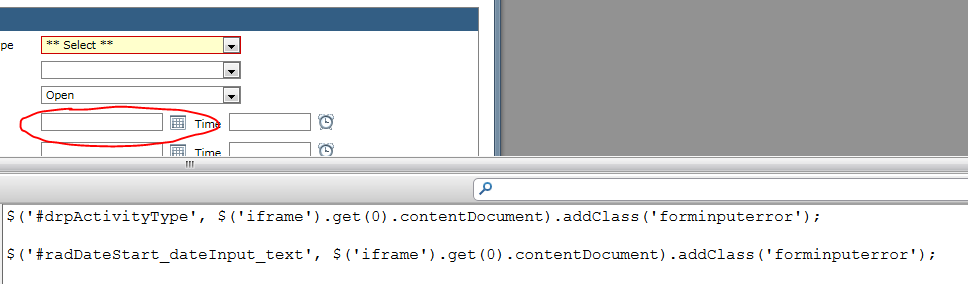 // in the case that a contact has not been selected from the Contacts dropdown listsJQuery += " $('#drpProspectContact').addClass('forminputerror'); ";// In the case that the RadDatePicker date does not have a valid value in it. sJQuery += " $('#dpForecastCloseDate_dateInput_text').addClass('forminputerror'); ";Note: forminputerror puts a red line around the border and colors the background of the inputs.