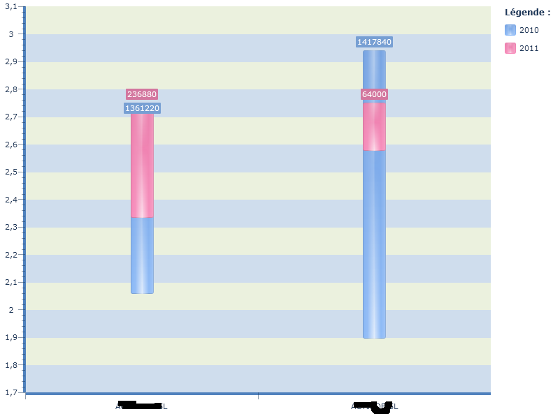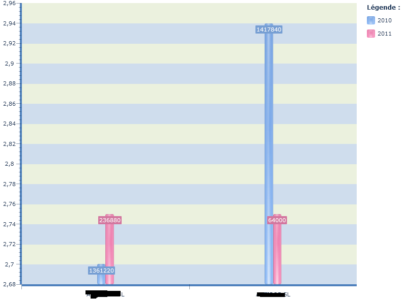 <telerikChart:RadChart Grid.Row="1" x:Name="pmvRangesChart" ItemsSource="{Binding RangesChartDataSource}" telerik:Theming.Theme="Windows7" BorderThickness="0" Background="White"> <telerikChart:RadChart.SeriesMappings> <telerikCharting:SeriesMapping> <telerikCharting:SeriesMapping.SeriesDefinition> <telerikCharting:RangeBarSeriesDefinition ShowItemLabels="True" ItemLabelFormat="#DATAITEM.VOLUME_TOTAL{#}" > <telerikCharting:RangeBarSeriesDefinition.LabelSettings> <telerikCharting:BarLabelSettings Distance="-20" /> </telerikCharting:RangeBarSeriesDefinition.LabelSettings> </telerikCharting:RangeBarSeriesDefinition> </telerikCharting:SeriesMapping.SeriesDefinition> <telerikCharting:SeriesMapping.GroupingSettings> <telerikCharting:GroupingSettings ShouldCreateSeriesForLastGroup="True"> <telerikCharting:GroupingSettings.GroupDescriptors> <telerikCharting:ChartGroupDescriptor Member="Annee"/> </telerikCharting:GroupingSettings.GroupDescriptors> </telerikCharting:GroupingSettings> </telerikCharting:SeriesMapping.GroupingSettings> <telerikCharting:ItemMapping FieldName="PMV_MIN" DataPointMember="Low" /> <telerikCharting:ItemMapping FieldName="PMV_MAX" DataPointMember="High" /> <telerikCharting:ItemMapping FieldName="GroupeArticleNom" DataPointMember="XCategory"/> </telerikCharting:SeriesMapping> </telerikChart:RadChart.SeriesMappings> </telerikChart:RadChart>It produce the result shown in the screenshot "rangebar grouping.png"
