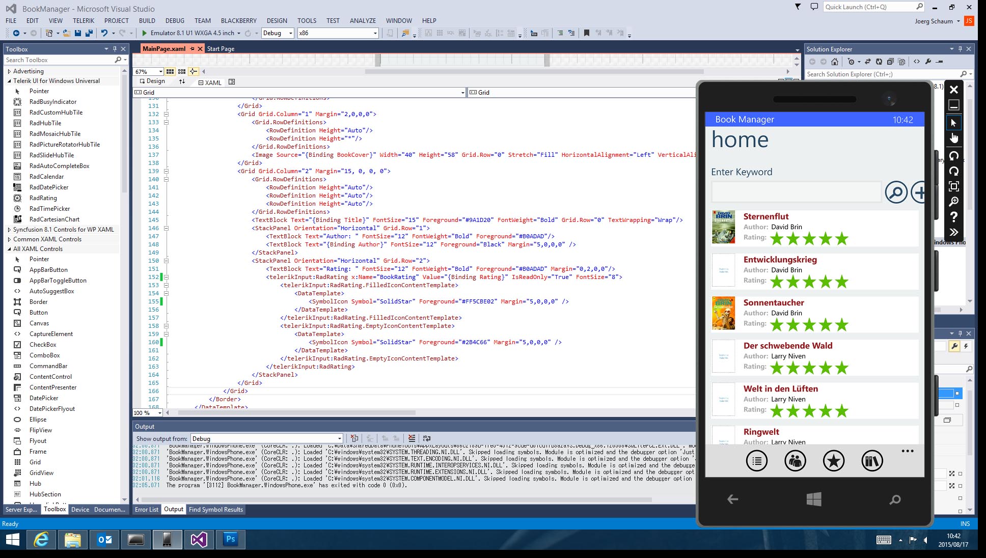 <Grid Grid.Column="2" Margin="15, 0, 0, 0"> <Grid.RowDefinitions> <RowDefinition Height="Auto"/> <RowDefinition Height="Auto"/> <RowDefinition Height="Auto"/> </Grid.RowDefinitions> <TextBlock Text="{Binding Title}" FontSize="15" Foreground="#9A1D20" FontWeight="Bold" Grid.Row="0" TextWrapping="Wrap"/> <StackPanel Orientation="Horizontal" Grid.Row="1"> <TextBlock Text="Author: " FontSize="12" FontWeight="Bold" Foreground="#B0ADAD"/> <TextBlock Text="{Binding Author}" FontSize="12" Foreground="Black" Margin="5,0,0,0" /> </StackPanel> <StackPanel Orientation="Horizontal" Grid.Row="2"> <TextBlock Text="Rating: " FontSize="12" FontWeight="Bold" Foreground="#B0ADAD" Margin="0,2,0,0"/> <telerikInput:RadRating x:Name="BookRating" Value="{Binding Rating}" IsReadOnly="True" FontSize="8"> <telerikInput:RadRating.FilledIconContentTemplate> <DataTemplate> <SymbolIcon Symbol="SolidStar" Foreground="#FF5CBE02" Margin="5,0,0,0" /> </DataTemplate> </telerikInput:RadRating.FilledIconContentTemplate> <telerikInput:RadRating.EmptyIconContentTemplate> <DataTemplate> <SymbolIcon Symbol="SolidStar" Foreground="#2B4C66" Margin="5,0,0,0" /> </DataTemplate> </telerikInput:RadRating.EmptyIconContentTemplate> </telerikInput:RadRating> </StackPanel> </Grid>I also include a screenshot. Thank you very much.