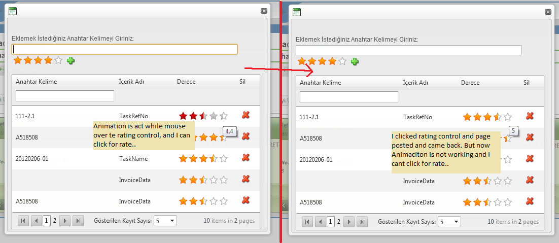 I have a radgrid and it has 2 column. last coumn is template column which has radrating control. I can use and rate when i open first time to the grid. Then I change to page and on second page I can't rate my rate control. And I is not showing selecting animation.