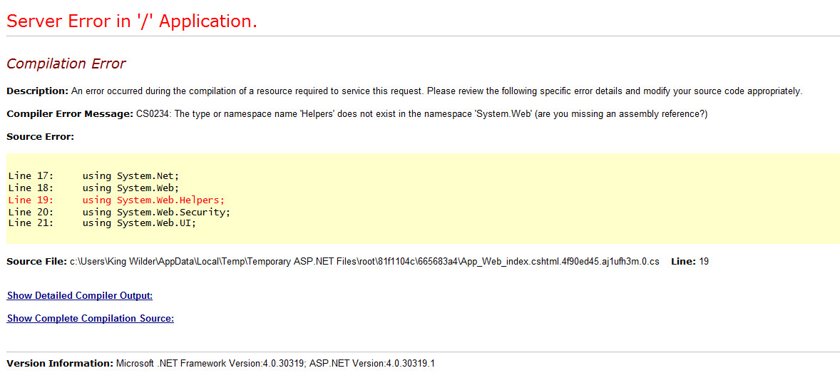 c:\Windows\Microsoft.NET\Framework\v4.0.30319\Temporary ASP.NET Files\temp\a70da4e5\d3633782\App_Web_huuamcba.2.cs(19): error CS0234: The type or namespace name 'Helpers' does not exist in the namespace 'System.Web' (are you missing an assembly reference?)