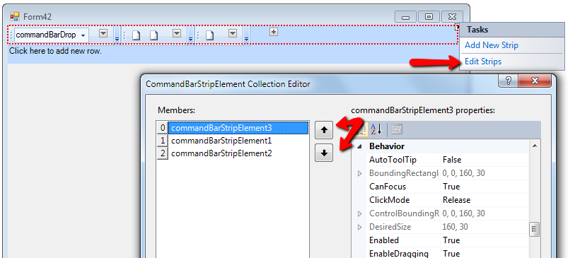 this.commandBarRowElement2.Strips.AddRange(new Telerik.WinControls.UI.CommandBarStripElement[] { this.commandBarStripElement1});Save the Designer.cs file and reopen the design time of the form.