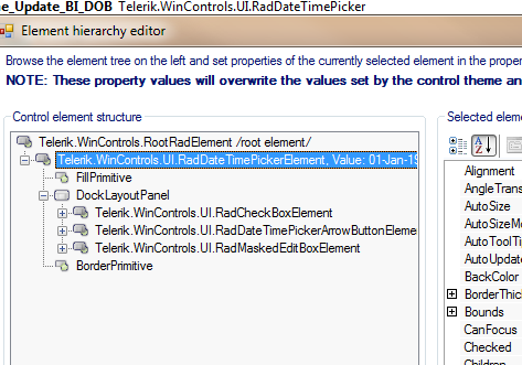 using System;using System.ComponentModel;using Telerik.WinControls.UI; public class RadDateTimePickerCustom : RadDateTimePicker { private bool m_IsReadOnly; private event EventHandler<EventArgs> ReadOnlyChanged; public bool IsReadOnly { get { return m_IsReadOnly; } set { m_IsReadOnly = value; if (ReadOnlyChanged != null) { ReadOnlyChanged(this, new EventArgs()); } } } private void Me_ReadOnlyChanged(object sender, EventArgs e) { if (m_IsReadOnly) { Opening += Me_Opening; DateTimePickerElement.TextBoxElement.TextBoxItem.ReadOnly = true; } else { Opening -= Me_Opening; DateTimePickerElement.TextBoxElement.TextBoxItem.ReadOnly = false; } } private void Me_Opening(object sender, CancelEventArgs e) { e.Cancel = m_IsReadOnly; } public RadDateTimePickerCustom() { ReadOnlyChanged += Me_ReadOnlyChanged; } }Don't know yet if the above will work or not. cant test it now. used the online documentation to find the Opening event and the nested TextBox Element. Dont know how to handle if a arrow is shown or an Up-Down? Don't know if the calendar dropdown is controlled. cant get to nested controls. There is a DockLayoutPanel in-between. See image attached.
