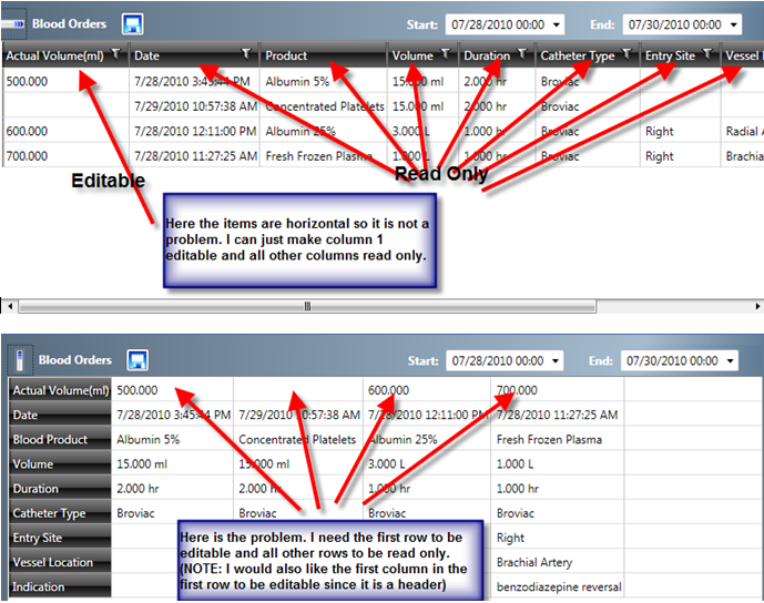 When horizontal is selected I do not have a problem because I can set columns to be readonly. However when I display the data vertically I need the top row, with the exception of the first column which now acts as the headers, to be editable and all other rows to be readonly. I have attached screen shots to demonstrate