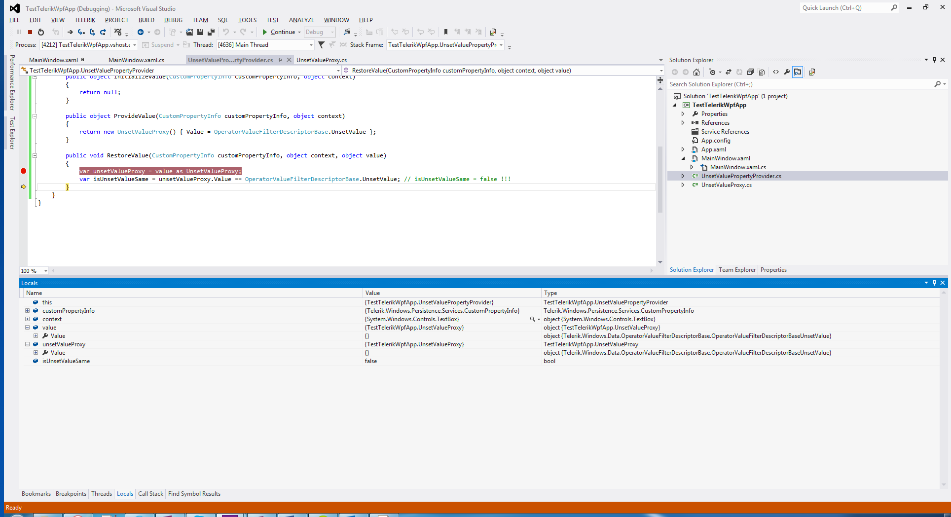 namespace TestTelerikWpfApp{ using Telerik.Windows.Data; using Telerik.Windows.Persistence.Services; class UnsetValuePropertyProvider : ICustomPropertyProvider { public CustomPropertyInfo[] GetCustomProperties() { return new CustomPropertyInfo[] { new CustomPropertyInfo("UnsetValue", typeof(UnsetValueProxy)) }; } public void InitializeObject(object context) { } public object InitializeValue(CustomPropertyInfo customPropertyInfo, object context) { return null; } public object ProvideValue(CustomPropertyInfo customPropertyInfo, object context) { return new UnsetValueProxy() { Value = OperatorValueFilterDescriptorBase.UnsetValue }; } public void RestoreValue(CustomPropertyInfo customPropertyInfo, object context, object value) { var unsetValueProxy = value as UnsetValueProxy; var isUnsetValueSame = unsetValueProxy.Value == OperatorValueFilterDescriptorBase.UnsetValue; // isUnsetValueSame = false !!! } }}UnsetValueProxy.cs: