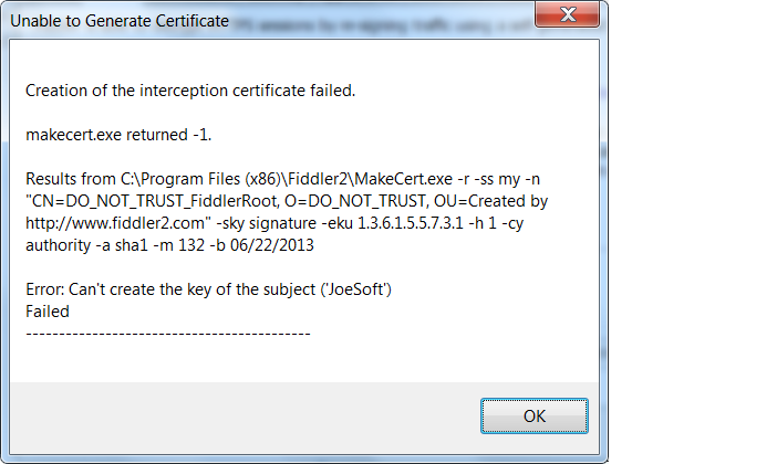 As of the beginning of June, we've started seeing a spike in the certificate-related issues out in the field for our production app. This spike has caused an 8-fold increase in the number of certificate-related tickets we see - we've been unable to reproduce these issues in house, and examination of our customers' machines has showed that their Personal certificate store appears to be corrupted. When we installed Fiddler .NET4 on their machines for debugging purposes and attempted to enable HTTPS traffic, we saw the attached "Creation of the interception certificate failed" - Googling this error yielded one possible solution of renaming or deleting the folder under C:\Users\[username]\AppData\Roaming\Microsoft\Crypto\RSA, and another solution of installing the FiddlerCert addon.