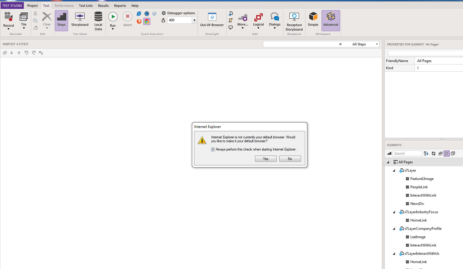 I then selected the "No" option, on the box asking if I wanted to make IE my default browser, and the Test Studio Browser opened in IE.