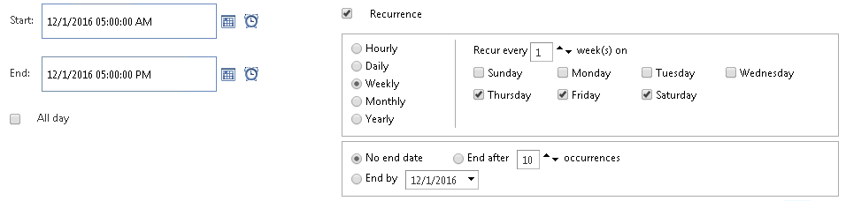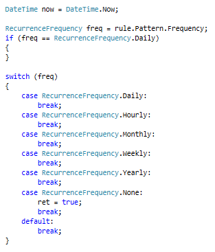 I have a question about how I can compare the current time against the schedule appointment. I set up the appointment with the Start date time (12-01-2016 7:00 PM), End date time (12-01-2016 7:15 PM), and the Recurrence Rule(Recur 1 time every week on Thursday). When the time comes, I'll display my image. For instance, if the current time is 12-01-2016 5:00 PM, my application does not show the image, and it does show up when the time is 7:01 PM. What is the best way to compare the current time against the appointment. I attach my screenshot here as well.