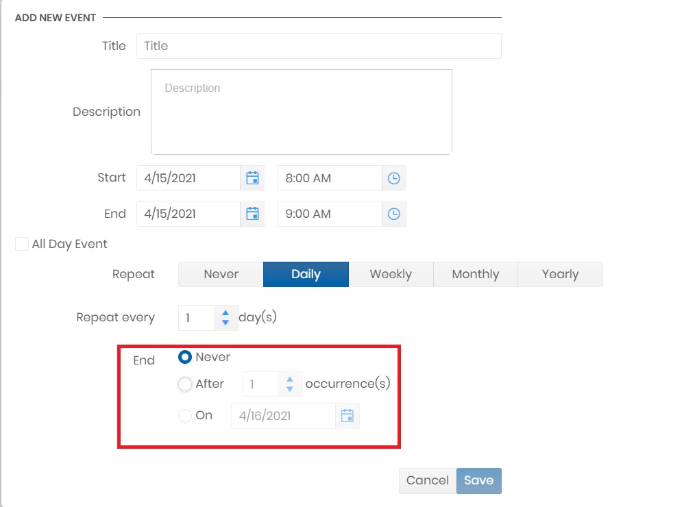 As for example the options to end a daily recurrence, it is the same with the other types of recurrence.