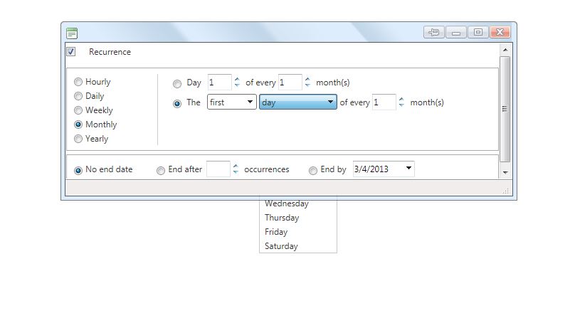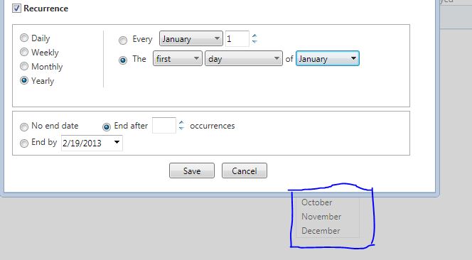 I have recurrence editor in rad window. When i click the monthly or yearly option the drop down list appears back of the rad window