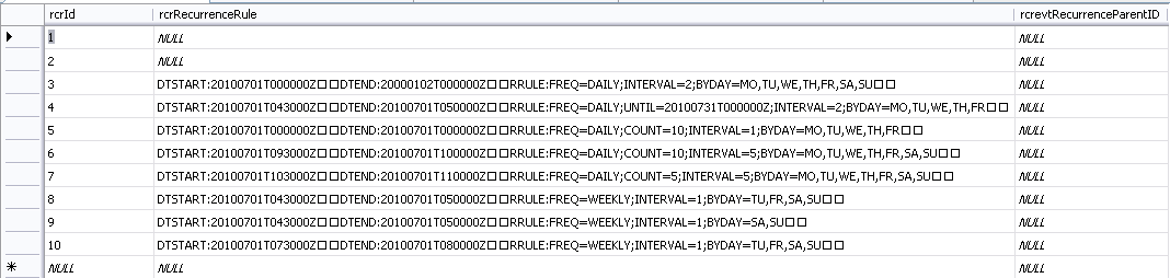 <Appointment> <ID>89</ID> <Subject>a</Subject> <Start>2010-07-19T10:00Z</Start> <End>2010-07-19T11:00Z</End> <RecurrenceRule><![CDATA[DTSTART:20100701T043000Z DTEND:20100701T050000Z RRULE:FREQ=DAILY;UNTIL=20100731T000000Z;INTERVAL=2;BYDAY=MO,TU,WE,TH,FR ]]></RecurrenceRule> </Appointment>I also tested creating a new appointment with the RadSchedulerRecurrenceEditor and this worked fine as well. Attached you will find a simple demo for reference.