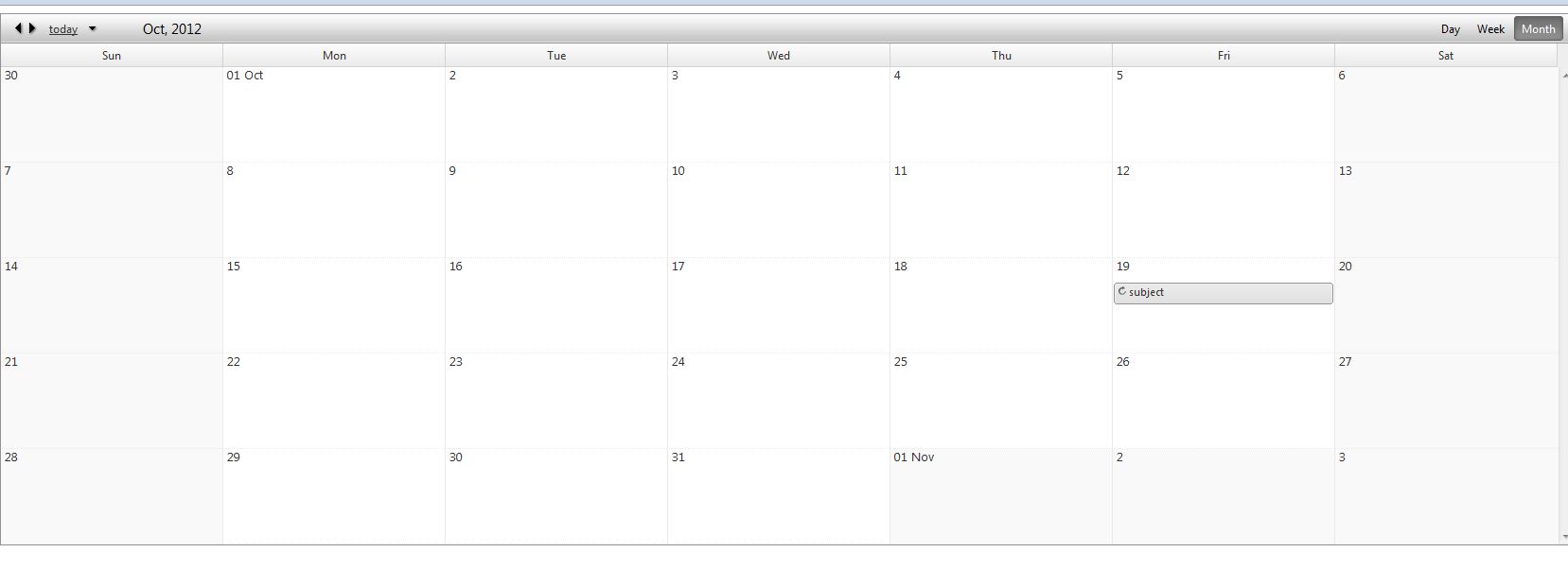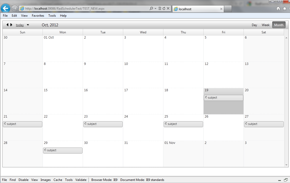 protected void Page_Load(object sender, EventArgs e){ RadScheduler1.SelectedView = Telerik.Web.UI.SchedulerViewType.DayView; RadScheduler1.SelectedDate = new DateTime(2012, 10, 19, 13, 0, 0); Appointment app = new Appointment { ID = 1, Start = new DateTime(2012, 10, 19, 13, 0, 0), End = new DateTime(2012, 10, 19, 15, 0, 0), Description = "description", Subject = "subject", RecurrenceState = RecurrenceState.Master, }; RecurrencePattern pattern = new RecurrencePattern(); pattern.Frequency = RecurrenceFrequency.Daily; pattern.DaysOfWeekMask = RecurrenceDay.EveryDay; RecurrenceRange range = new RecurrenceRange(); range.Start = new DateTime(2012, 10, 19, 13, 0, 0); range.RecursUntil = new DateTime(2012, 10, 30, 15, 0, 0); DailyRecurrenceRule rrule = new DailyRecurrenceRule(2, range); app.RecurrenceRule = rrule.ToString(); //DTSTART:20121019T130000Z\r\nDTEND:20121019T130000Z\r\nRRULE:FREQ=DAILY;UNTIL=20121030T150000Z;INTERVAL=2;BYDAY=MO,TU,WE,TH,FR,SA,SU\r\n RadScheduler1.InsertAppointment(app);}