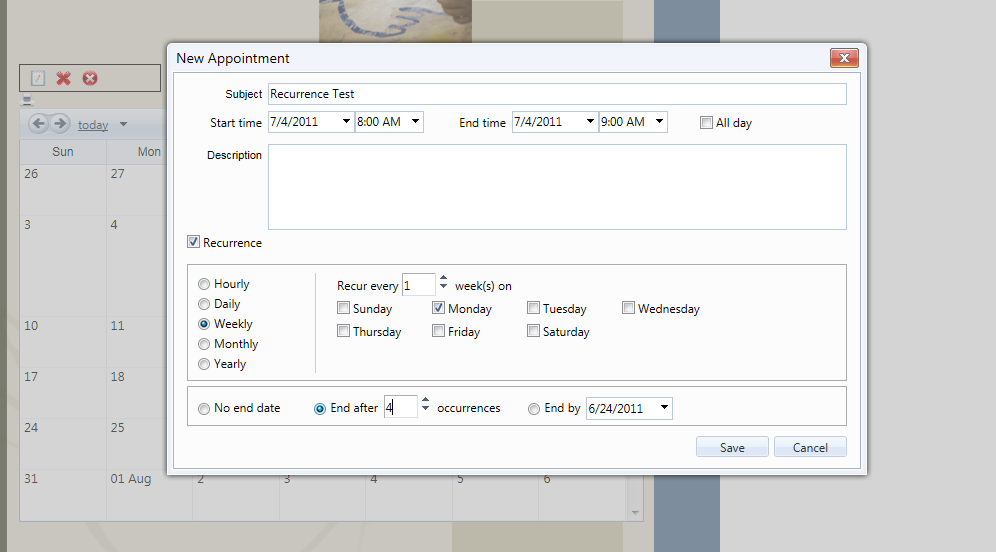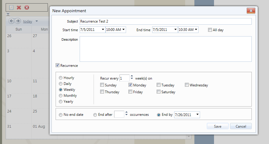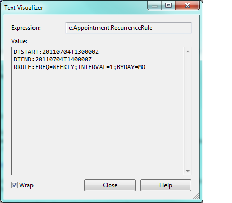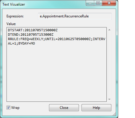 Here is the generated rule for an event that I set with Weekday occurrence, starting on 7/4/2011 and it was supposed to end on 7/9/2011: